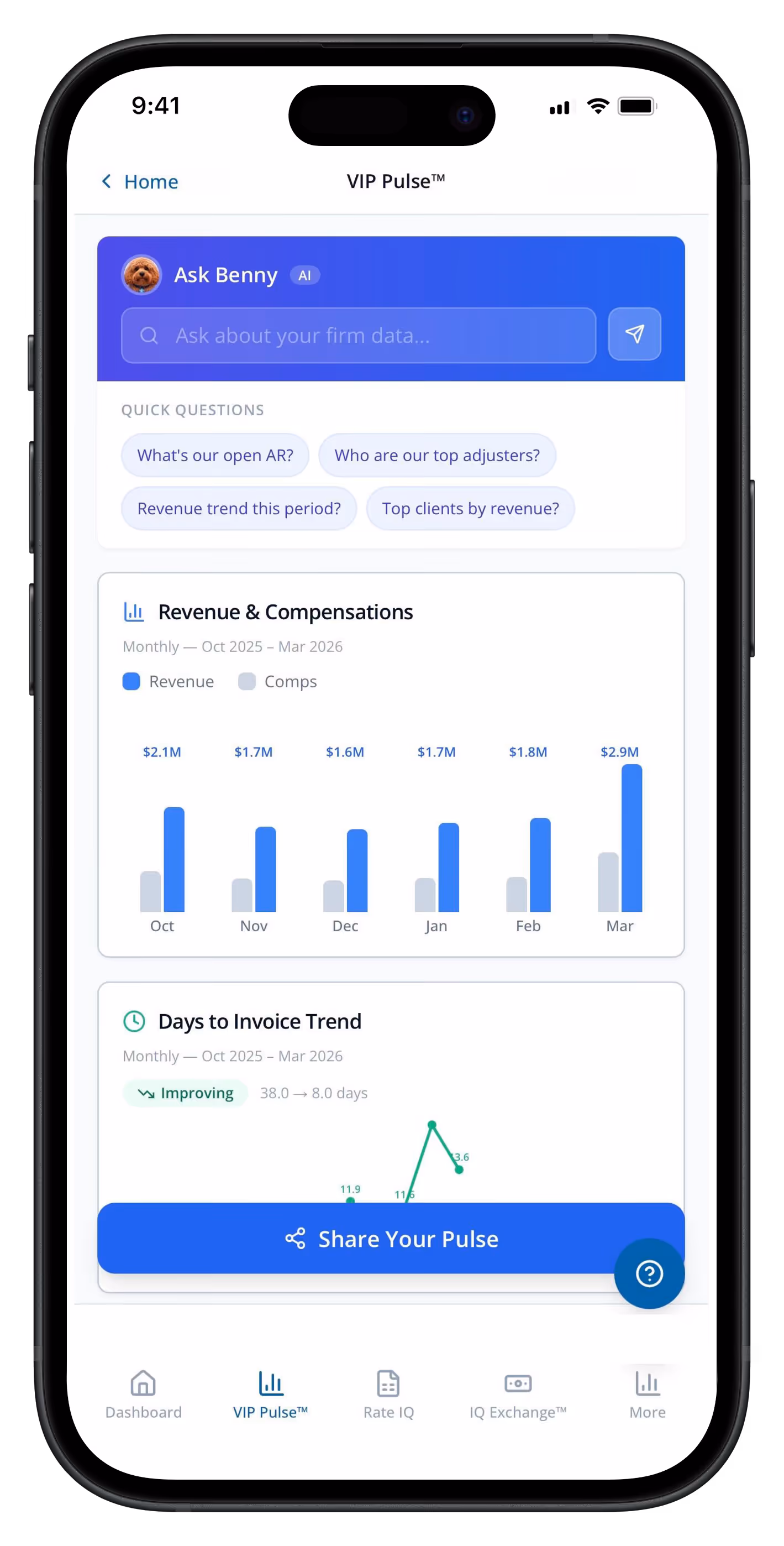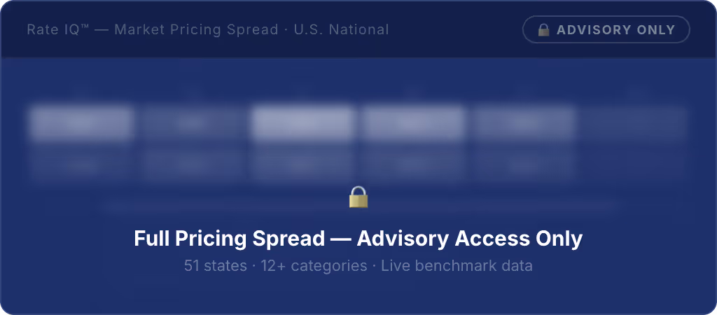 A partial view of the Rate IQ™ intelligence dashboard — available only to advisory partners in private beta. Real market data, pricing benchmarks, and performance positioning across claims categories.